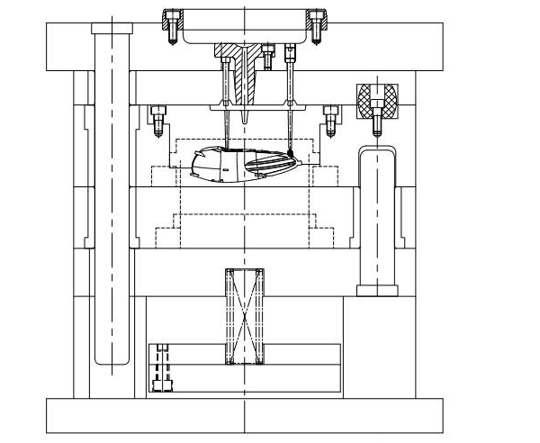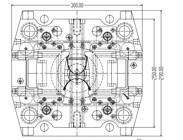 兩套模胚的雙色模具,具有兩個完全相同的后模,而兩個前模型腔是不同的,用于注射不同的物料。這就要求兩套模胚完全相同,由于需要互換配合,模胚需要具備很高的精度。一般要求模具的加工精度在0.01以內(nèi)。注意模胚的導(dǎo)柱導(dǎo)套孔仍然需要基準(zhǔn)角偏置,以防加工時出錯,和普通單色模具一樣。另外一點(diǎn)需要注意的是模具必須設(shè)計成三板模的形式,在一次注塑后,二次注塑前,水口料需要及時分離。